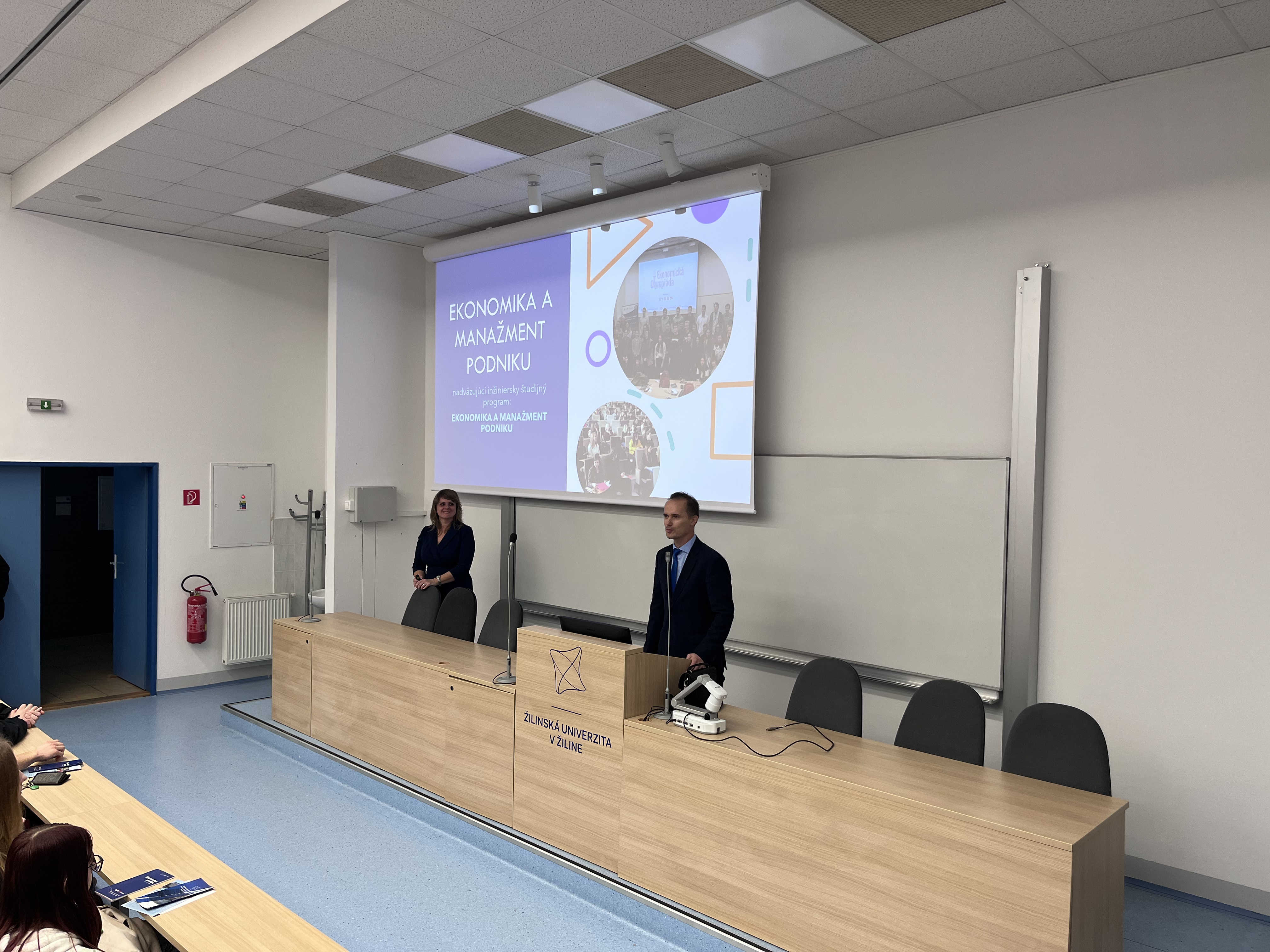 Študijný program Ekonomika a manažment podniku predstavil prof. Ing. Pavol Kráľ, PhD., ktorý zdôraznil moderné riadenie procesov, digitalizáciu a prepojenie na reálne potreby podnikov. Študijný program Finančný manažment predstavila prodekanka pre vzdelávaciu činnosť doc. Ing. Katarína Valášková, PhD.; zároveň priblížila aj samotnú fakultu PEDAS, jej zázemie, laboratóriá, možnosti stáží a priestory, v ktorých študenti riešia praktické zadania.