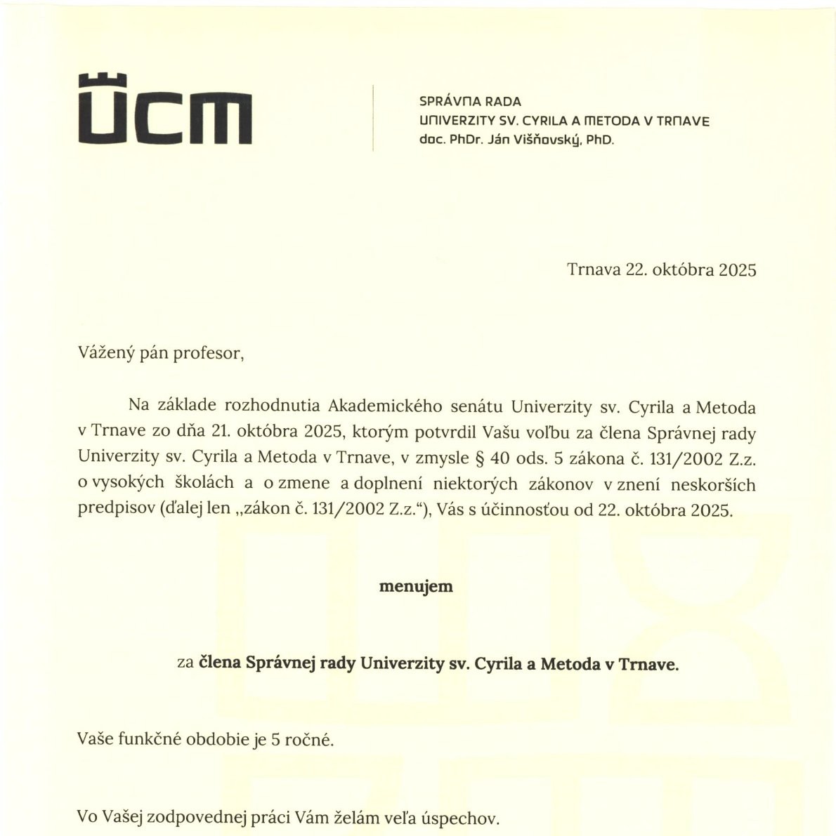 Dňa 22. októbra 2025 bol prof. Ing. Tomáš Klieštik, PhD. oficiálne vymenovaný za člena Správnej rady Univerzity sv. Cyrila a Metoda v Trnave. Rozhodnutie nadväzuje na uznesenie Akademického senátu UCM z 21. októbra 2025, ktorý potvrdil jeho zvolenie do tejto významnej akademickej funkcie.