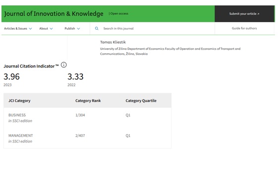 S radosťou si Vám dovoľujeme oznámiť, že náš kolega, prof. Klieštik akceptoval pozvanie prof. Juan Piñeiro-Chousa a prijal členstvo v redakčnej rade vedeckého časopisu Journal of Innovation & Knowledge, ktorý je podľa databázy Web of Science registrovaný v kategórii BUSINESS ako najlepší na svete a v kategórii MANAGEMENT ako druhý najlepší na svete.
