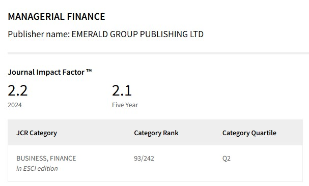 Časopis Managerial Finance patrí medzi uznávané vedecké periodiká v oblasti financií. Podľa najnovších dostupných metrik za rok 2024 dosahuje: